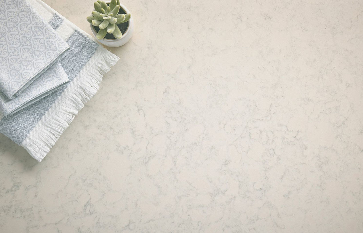 This design sample is a small select cut from a slab; it does not fully exhibit all the design characteristics of the final installed product. Cambria is pure natural quartz. Variations in the natural quartz stone color, pattern, size, shape, and shade are unique and inherent characteristics of this product. Cambria is not a seamless product; seams are visible. Where there are seams, the product pattern and shade will change. These variations do not affect performance and do not qualify for product replacement. Cambria Matte® finish will show surface markings caused during normal use, which are easily removed by simply washing with a soft cotton cloth and warm water; use a mild soap if desired.