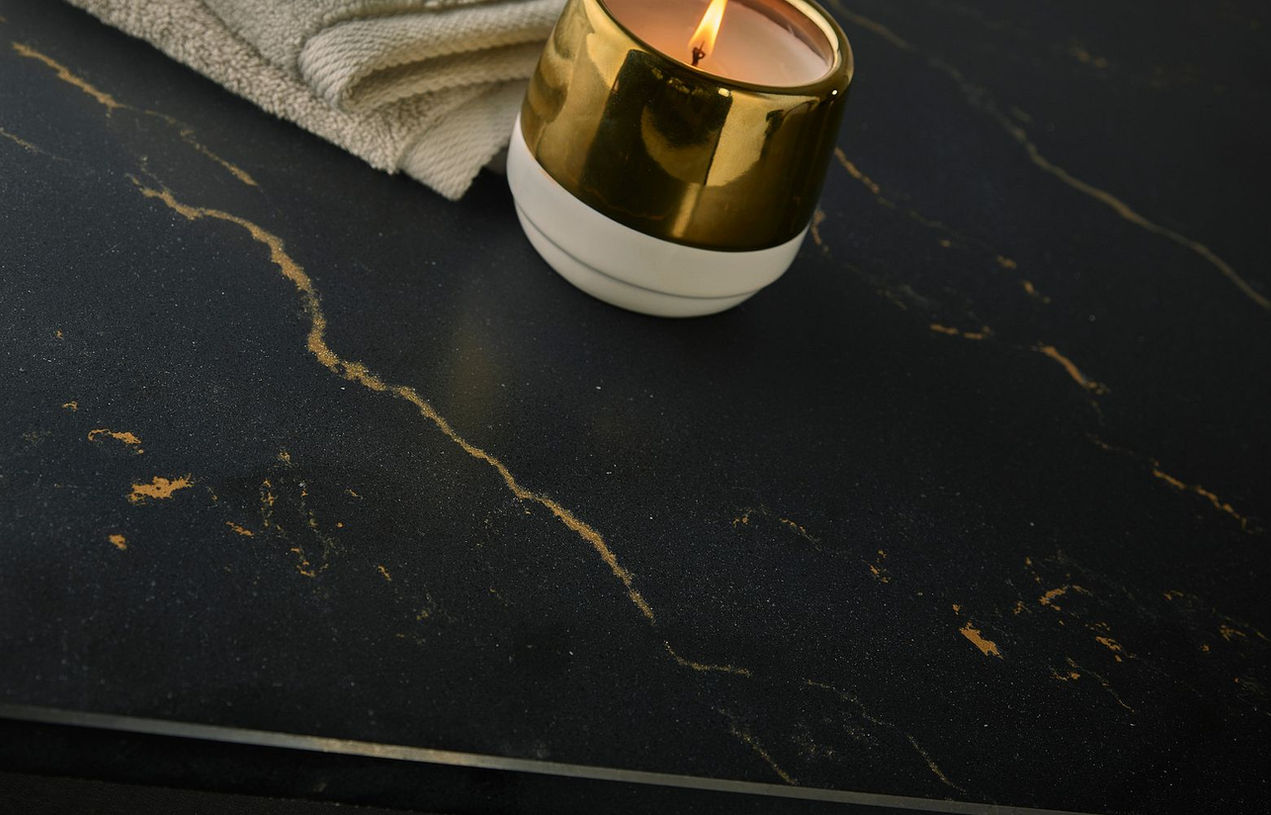 This design sample is a small select cut from a slab; it does not fully exhibit all the design characteristics of the final installed product. Cambria is pure natural quartz. Variations in the natural quartz stone color, pattern, size, shape, and shade are unique and inherent characteristics of this product. Cambria is not a seamless product; seams are visible. Where there are seams, the product pattern and shade will change. These variations do not affect performance and do not qualify for product replacement. Cambria Matte® finish will show surface markings caused during normal use, which are easily removed by simply washing with a soft cotton cloth and warm water; use a mild soap if desired. This design has large visible surface movement.