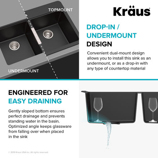 Kraus dual mount granite sinks create an instant style upgrade for the kitchen. Constructed from 80% natural granite, with the look and feel of real stone, these modern kitchen sinks look striking in a variety of settings. Clean lines and thoughtful design details highlight the organic elegance of granite, for an eye-catching look with contemporary appeal. The extra-deep basins accommodate large dishes with ease, while the gently rounded corners make sink maintenance simple. Each non-porous sink is protected with a thermal finishing process, creating a surface that is highly resistant to heat, chemicals, scratching, chipping, and discoloration. This double bowl sink provides a lifetime of functionality with versatile style. The 50/50 split basin adds flexibility for a variety of kitchen tasks. The basin is self rimming, creating a finished look for your kitchen. Choose from easy topmount installation, or install the sink as an undermount for a seamless look. For added convenience, a basket strainer drain assembly and complimentary towel are included free with purchase. Constructed from premium stainless steel, the top-quality basket strainer assembly creates a tight seal to prevent food and debris from clogging the drainpipe. For easy installation, all mounting hardware is provided. Experience Kraus Quality and bring your best kitchen ideas to life. . . Read More