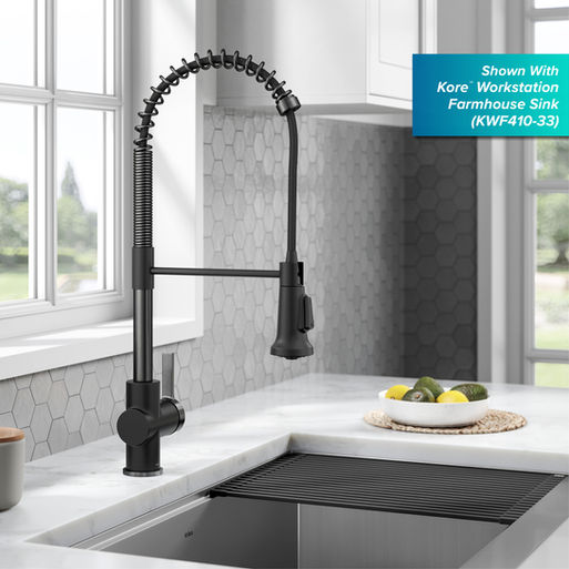 The Britt Commercial Style Faucet features a striking silhouette with exposed-spring design and impressively tall high-arc spout. The clean aesthetic adapts to any kitchen style, with a pull-down sprayhead that provides dynamic functionality. The 3-function sprayer with swivel adapter provides maneuverability so you can flex, pivot, and reach all around the sink. The single lever handle is designed with 90-degree forward rotation for installation in tight spaces and ease of use. Robust design features a metal body and premium components, including ceramic cartridge, snap-on counterweight, and quick connect sprayer hose for leak-free use. Comes with pre-attached water lines and mounting hardware for easy installation. Available in a range of finishes, including Spot-Free options. . . Read More